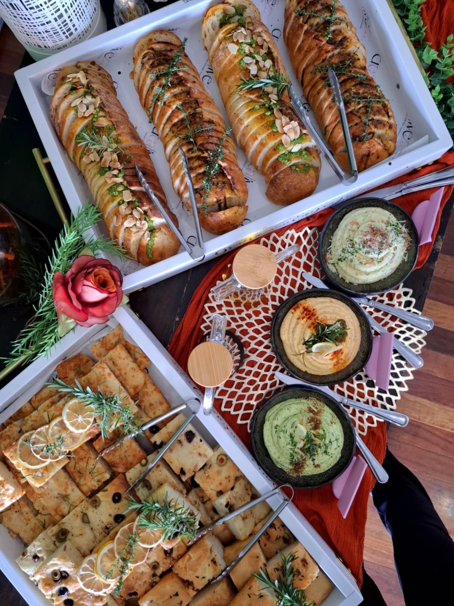 - Grilled Herb and Garlic Flatbread with sundried tomato pesto & Beetroot hummus dips