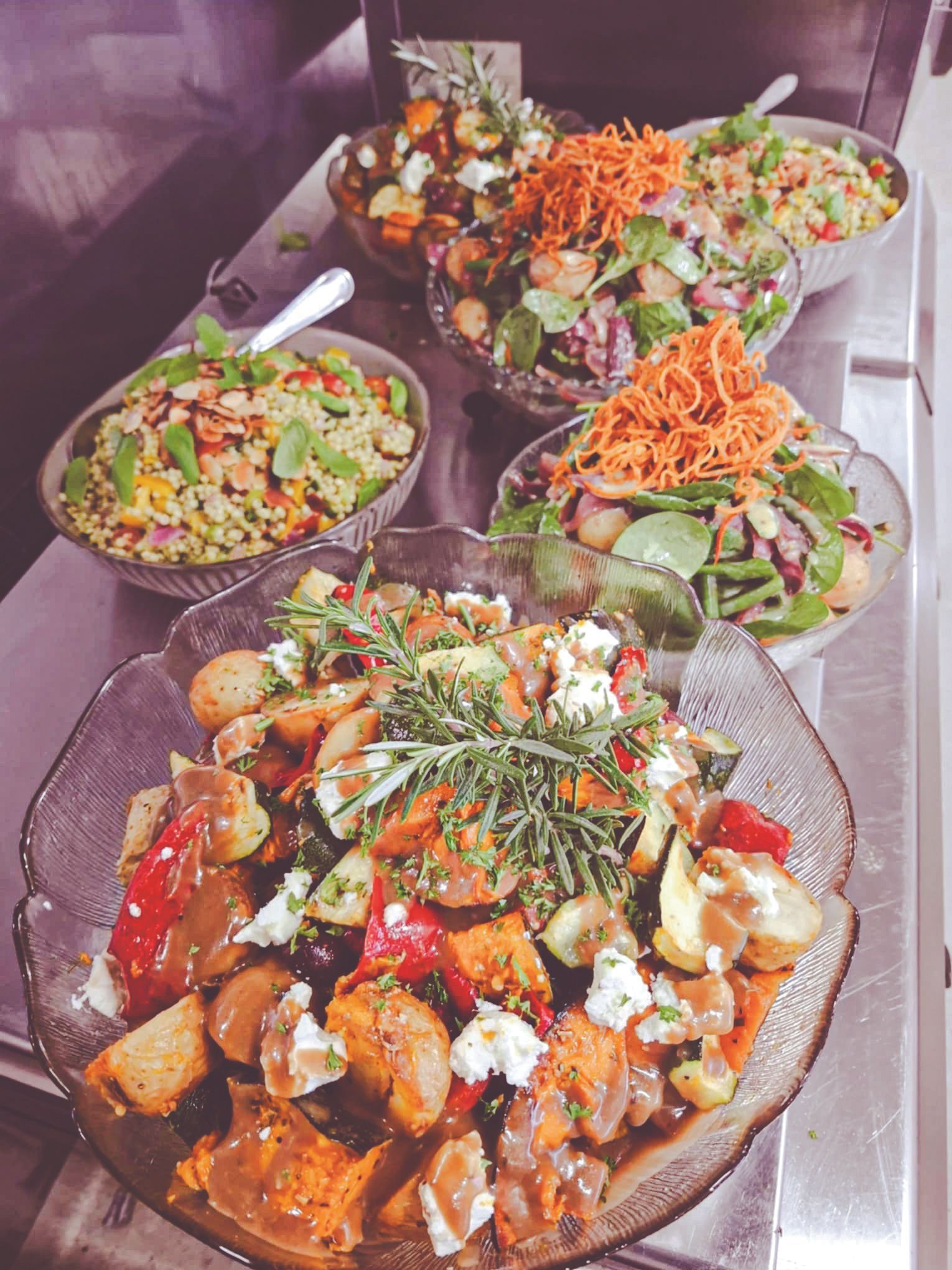 - Tuscan roast vegetable salad (pumpkin, sweet potato, potatoes, eggplant capsicum and kalamata olives) (GF, V)