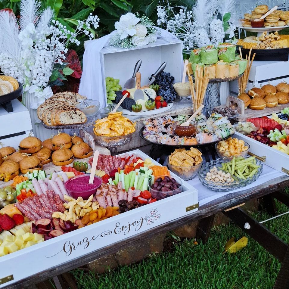 Grazing tables include gourmet cured meats, cheeses & small goods, seasonal fruit & vegetables, dips, crackers, fresh bread, nuts & dried fruits, antipasto & nibbles PLUS your choice of (6) additional options from our savoury/sweet menu.