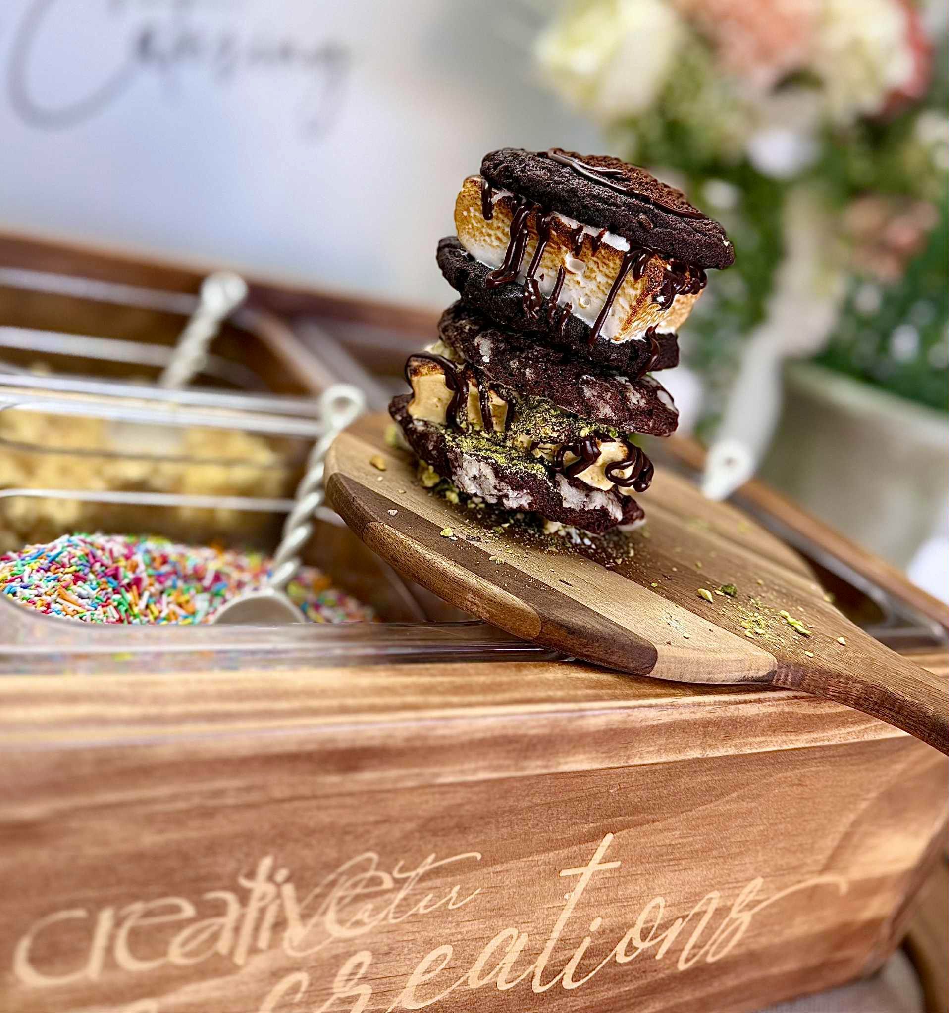 Guests can gather around, watch the marshmallows toasted to perfection, and then sandwich them between our house-baked cookies, drizzled with chocolate, and finished with creative toppings. It’s interactive, indulgent, and guaranteed to have everyone coming back for seconds.