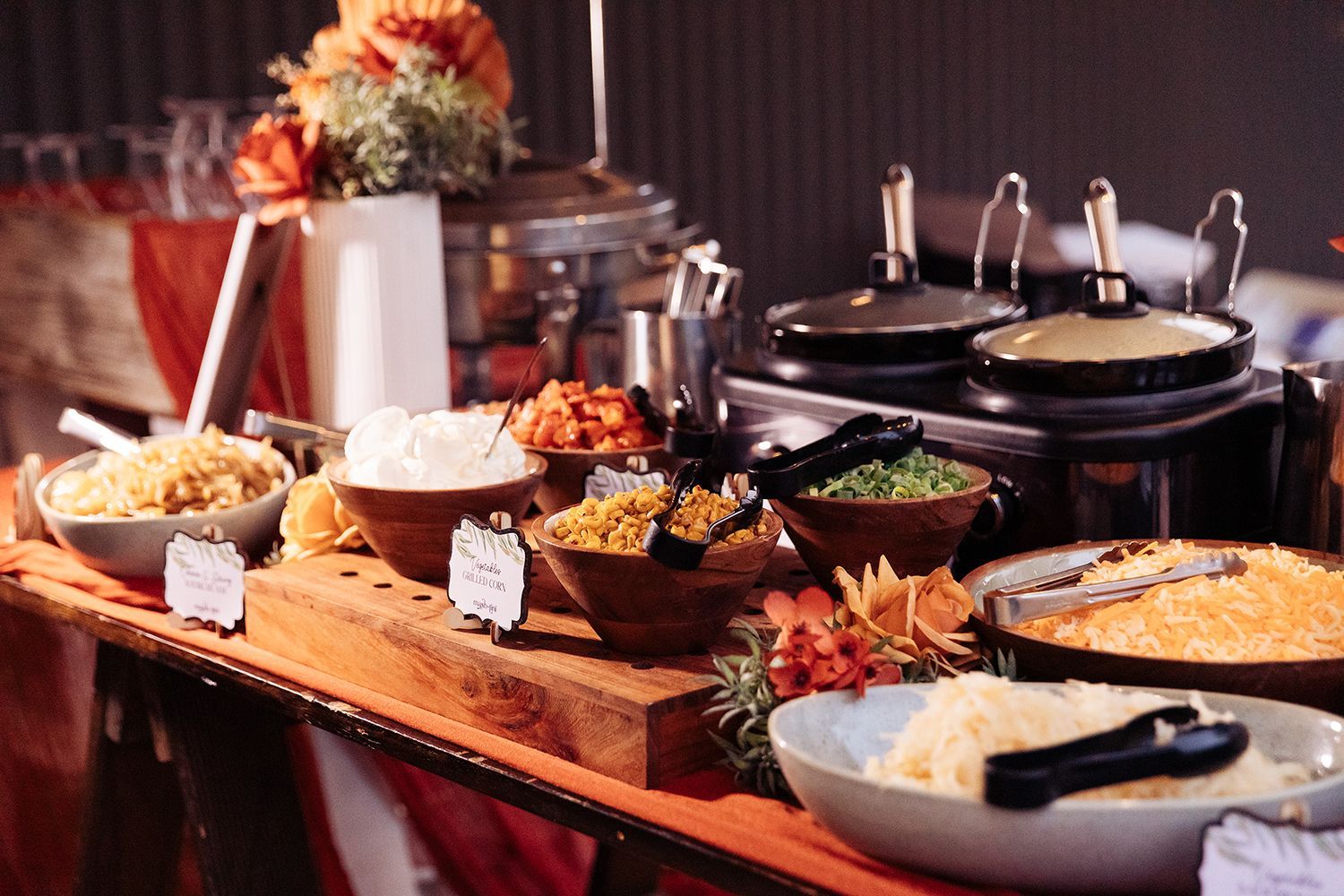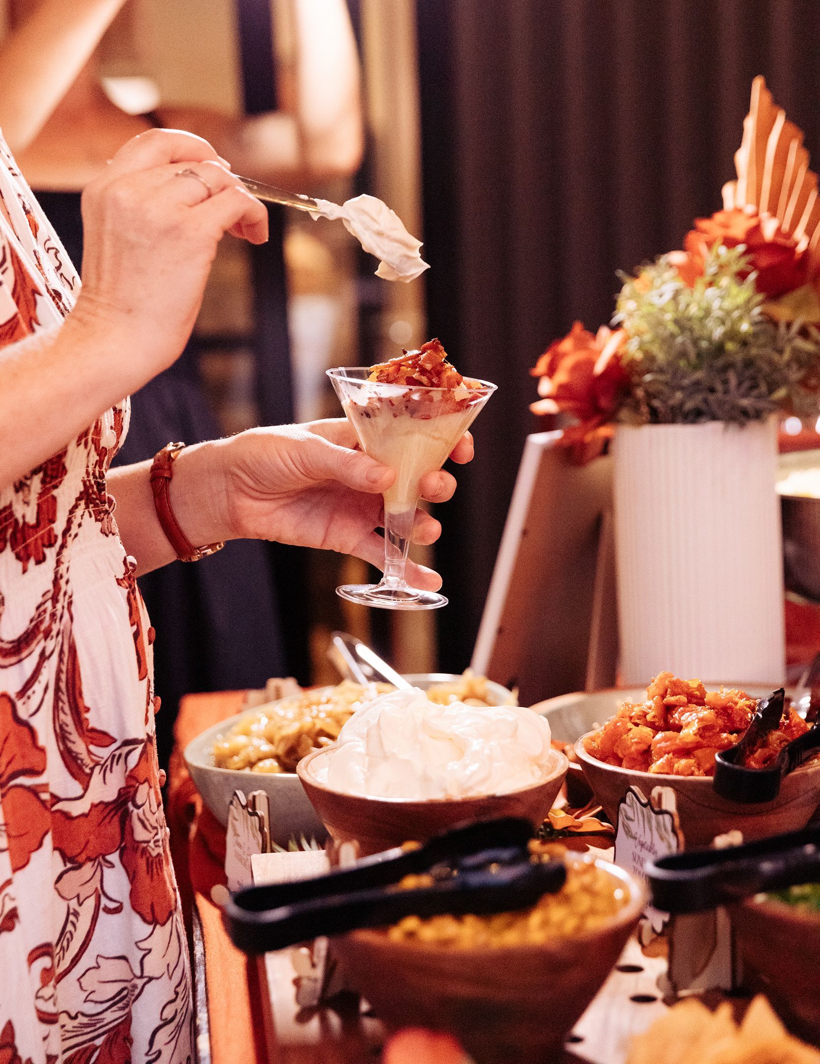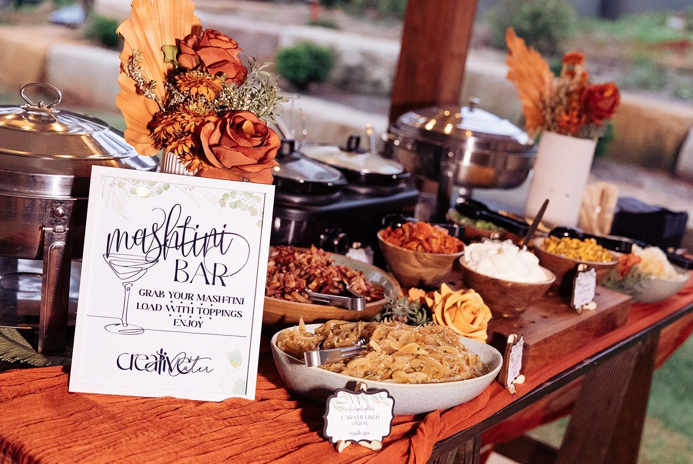 Who says mash is just a side? Our Mash-Tini Bar transforms creamy buttermilk mashed potatoes into a fun, interactive food experience your guests will love. Served in stylish martini glasses by our Creative Crew, this bar lets your guests build their own mash masterpiece — topped with gourmet proteins, fresh vegetables, cheeses, herbs, and sauces of their choice.